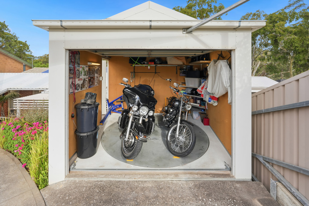 • Single garage with motorbike turntable (2 bikes) + overhead storage