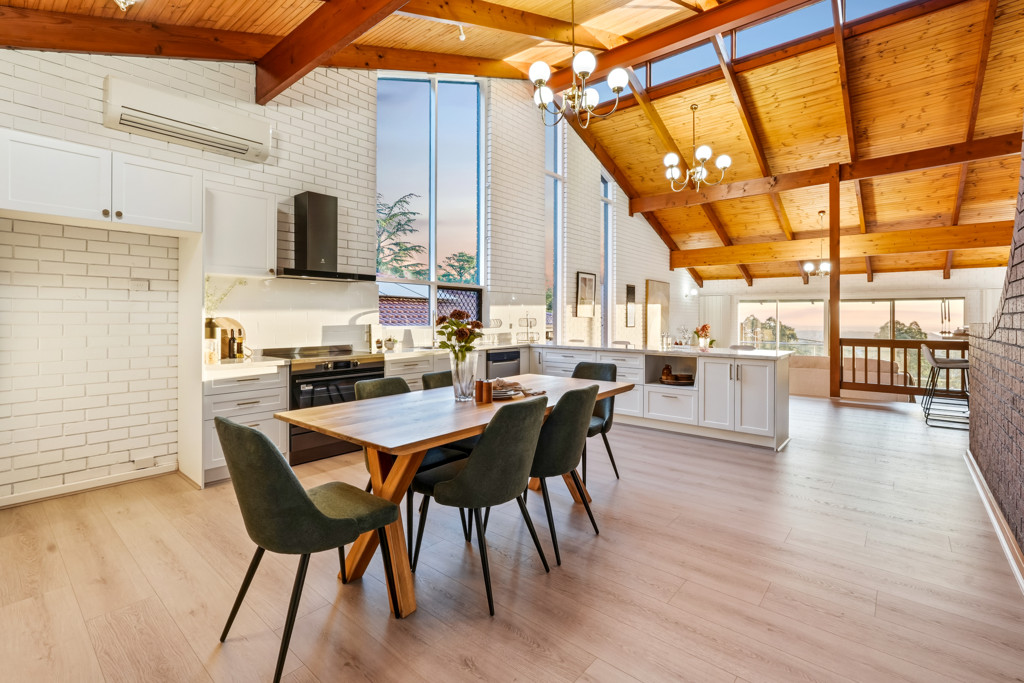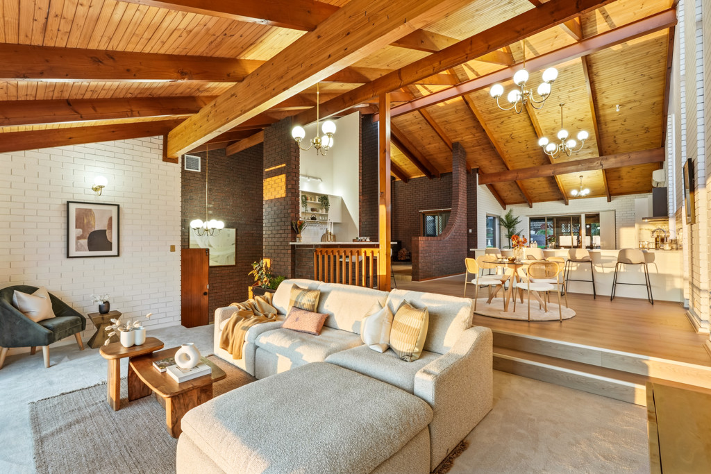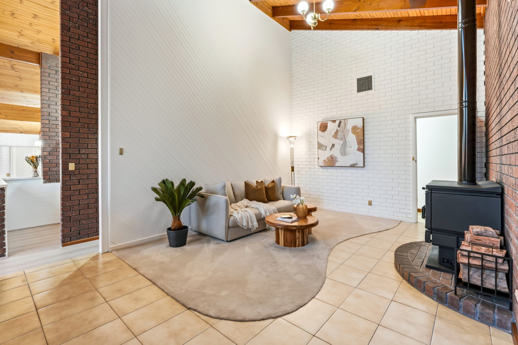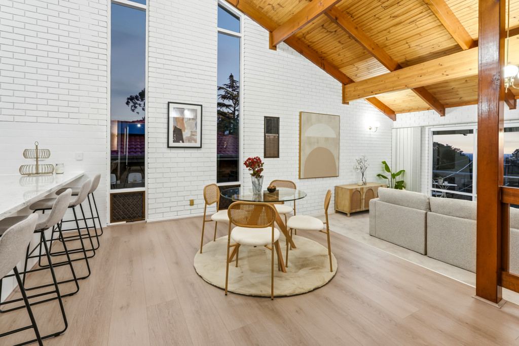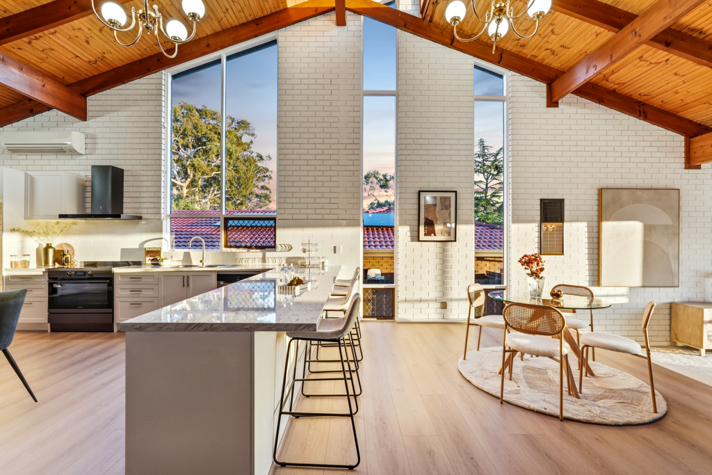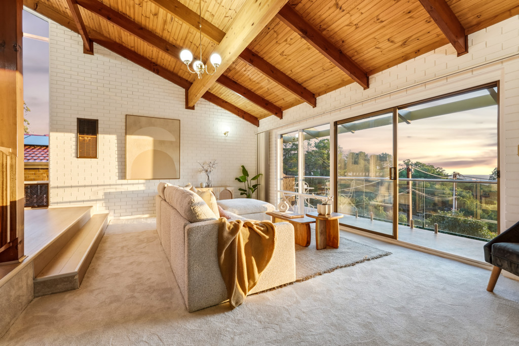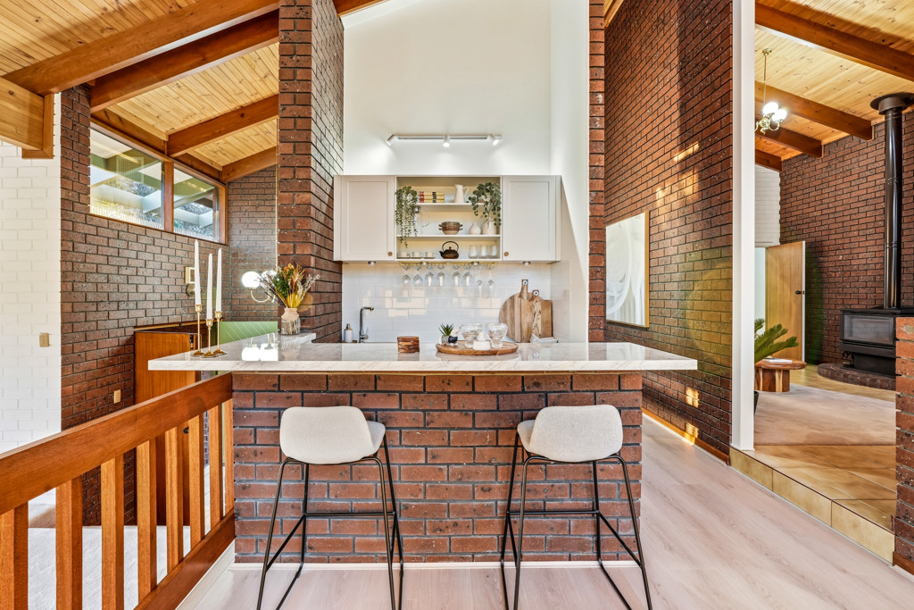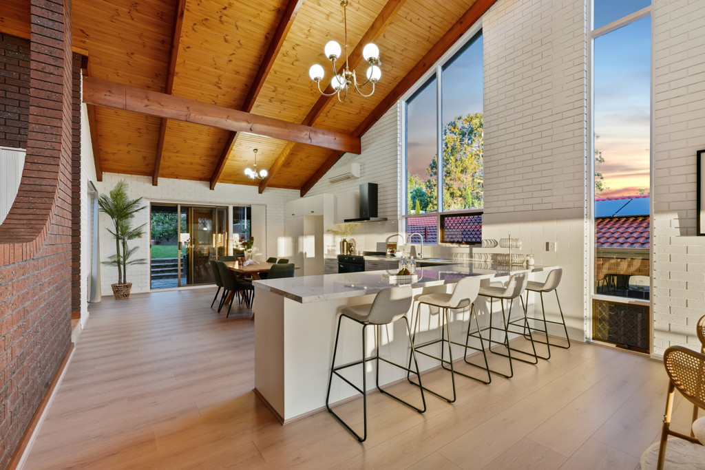 At the centre of the home, a stunning newly appointed kitchen makes a lasting impression. Featuring a 900mm Westinghouse oven, expansive benchtops, quality appliances, and a generous breakfast bar, it connects effortlessly to the main living domain. Raked ceilings enhance the sense of openness, while a bespoke bar with sink and bar fridge alcove creates the perfect setting for effortless entertaining.