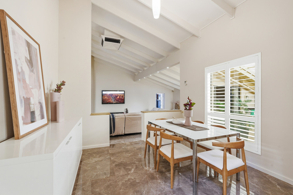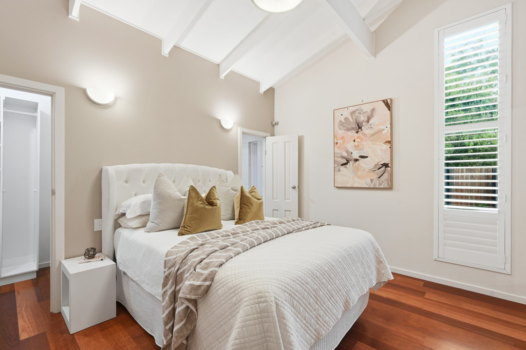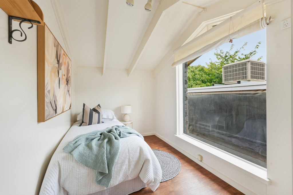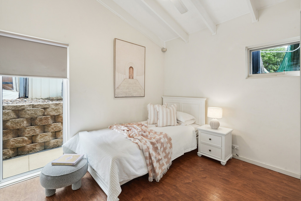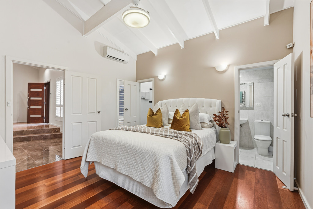 The master suite is a private sanctuary of impressive proportions, utilizing the vaulted ceilings to enhance the sense of space. Equipped with a split-system air conditioner, a walk-in wardrobe, and additional overhead storage, it is a masterclass in thoughtful design. The main bathroom services the home with luxury in mind, boasting a deep spa bath and a spacious shower.