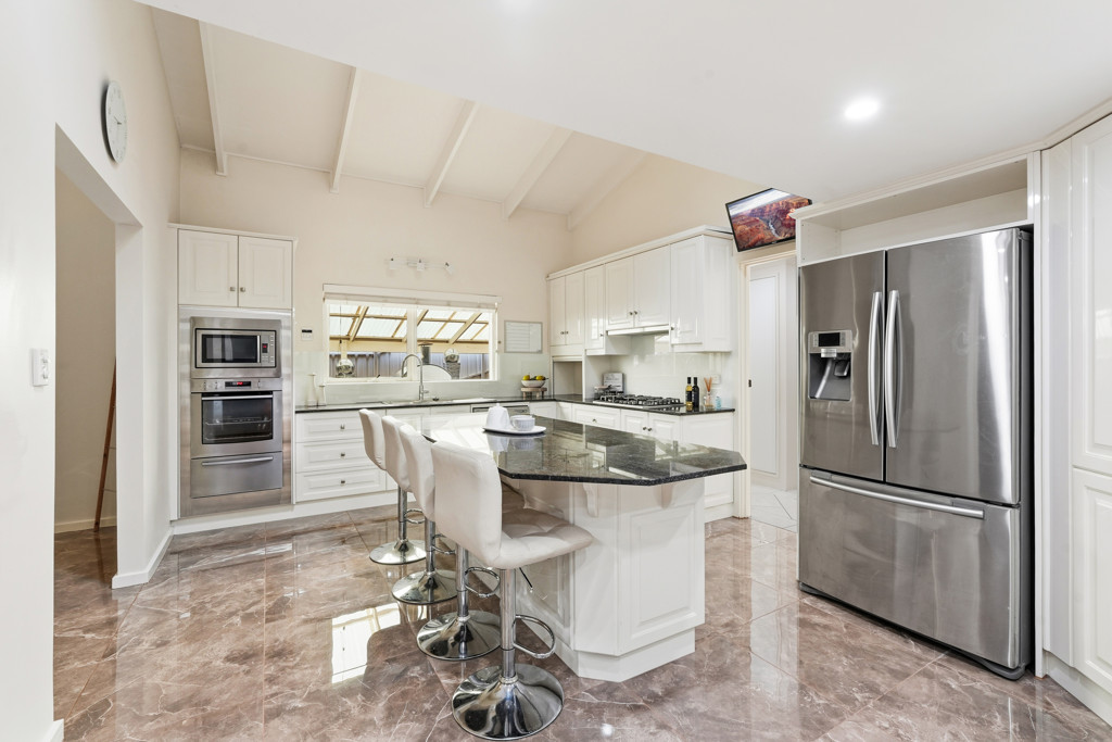 The heart of the home is a culinary masterpiece, where a large open-plan kitchen anchors the living space. Fitted with premium Westinghouse appliances, an integrated microwave, and a four-burner gas cooktop, it is as functional as it is beautiful. The expansive island bar serves as the natural gathering point, complemented by ample cabinetry and a dining room perfectly positioned to overlook the lounge.