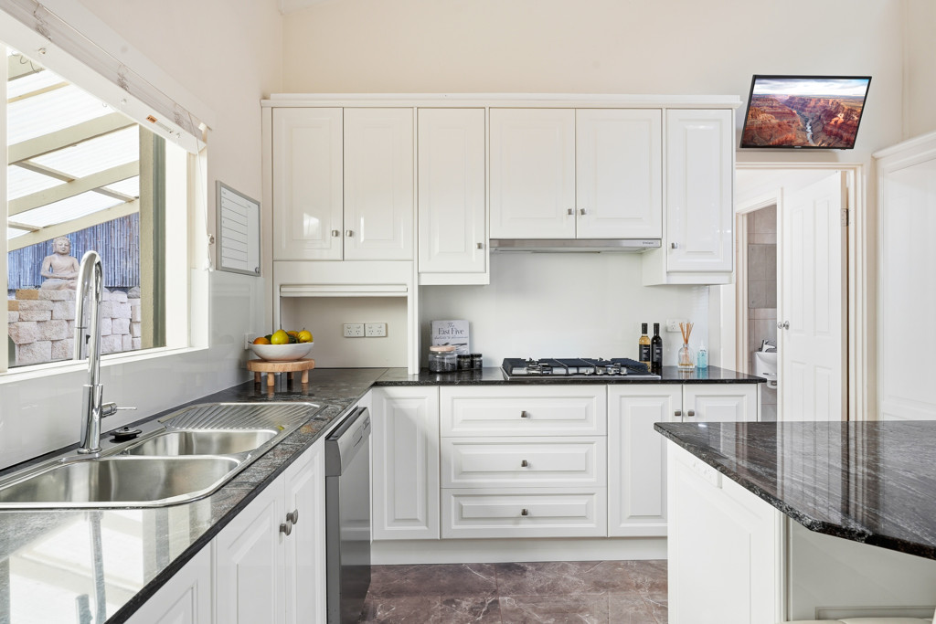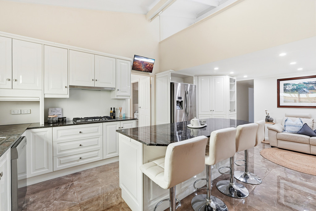 • Large open-plan kitchen boasting a substantial island bar, Westinghouse appliances, integrated microwave, and 4-burner gas cooking.