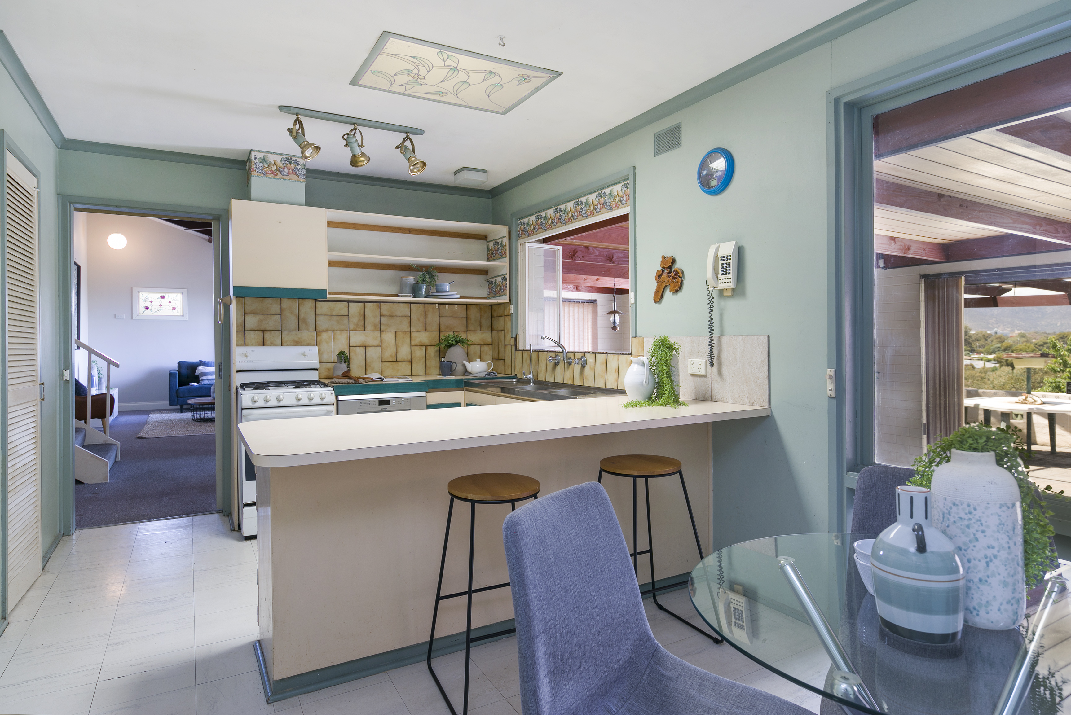 - Kitchen features ample bench top space, gas cooktop, overhead shelves and two separate pantries
