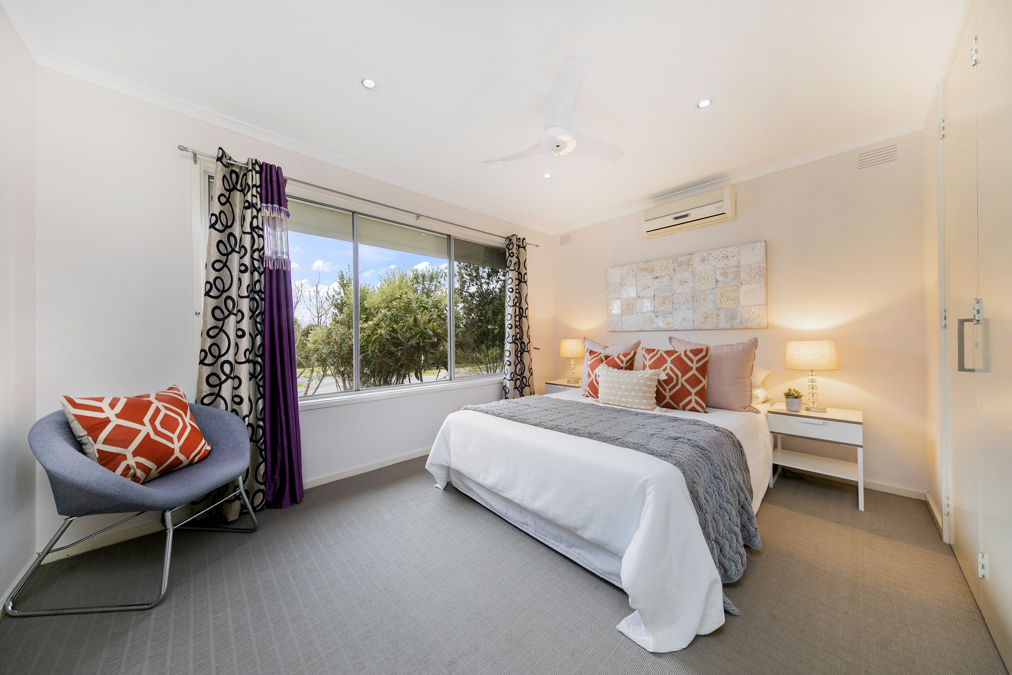 - Master bedroom with reverse cycle heating and cooling, ceiling fan and built In robes