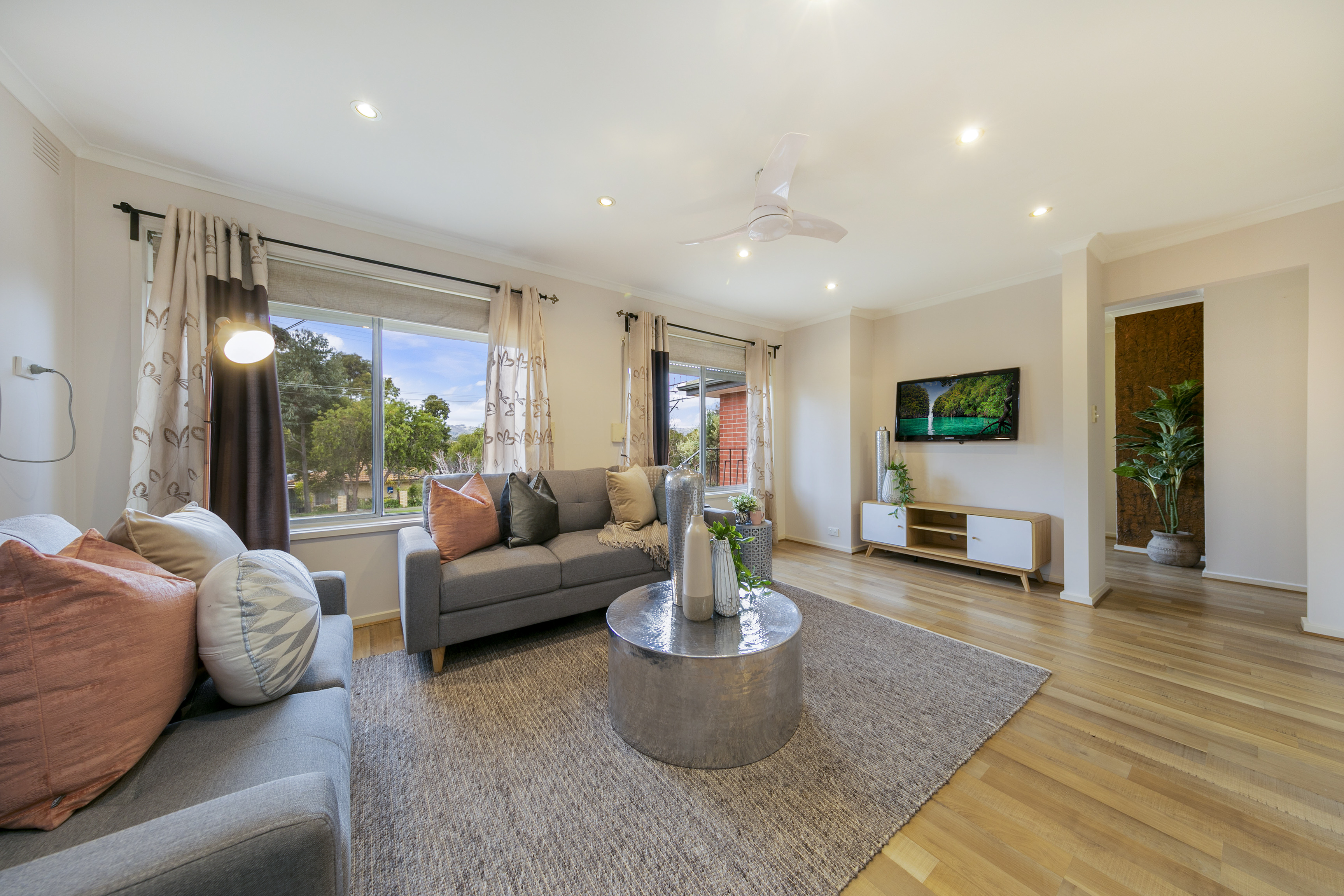 - Spacious lounge room with reverse cycle heating and cooling, ceiling fan and formal dining