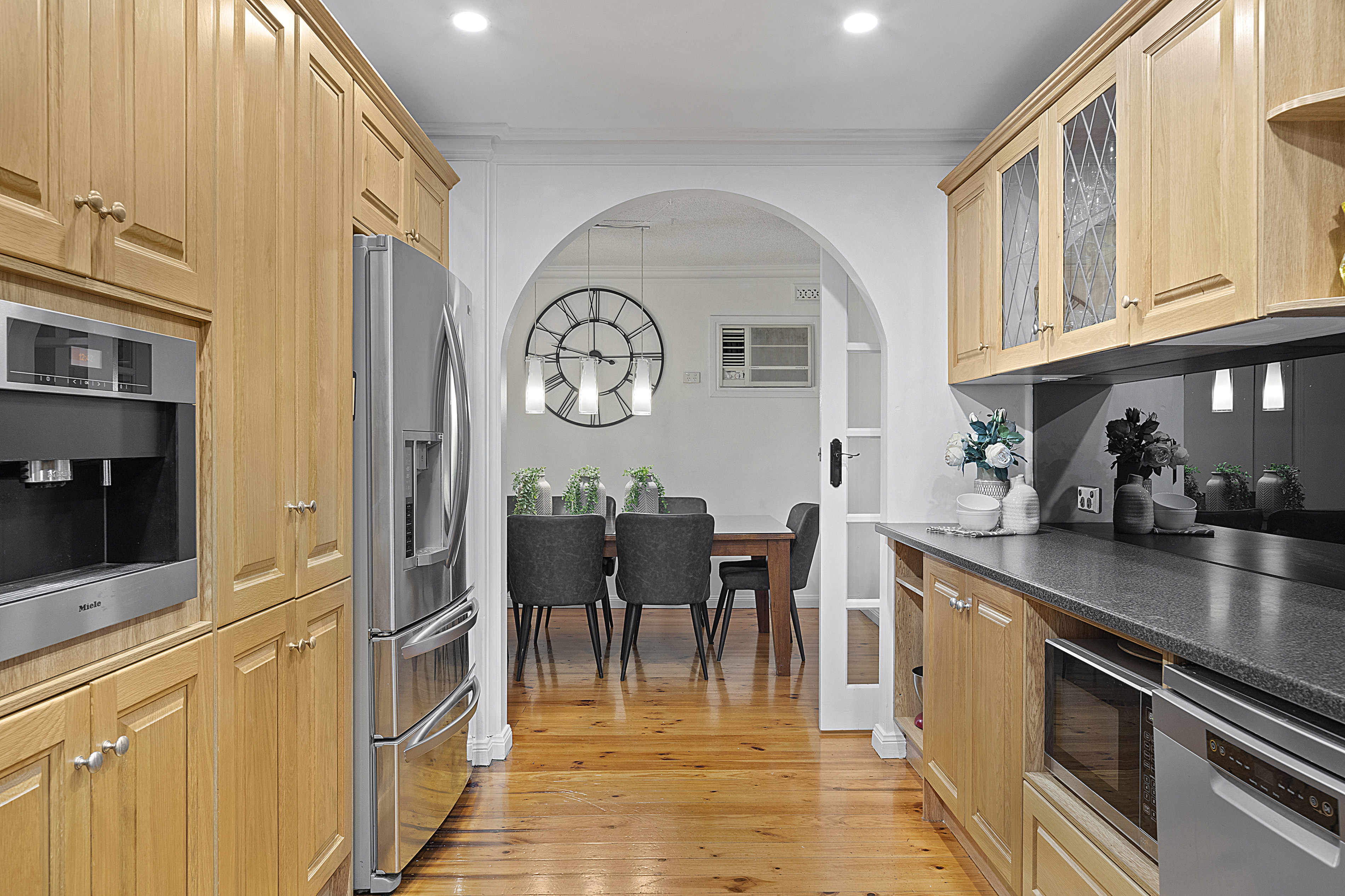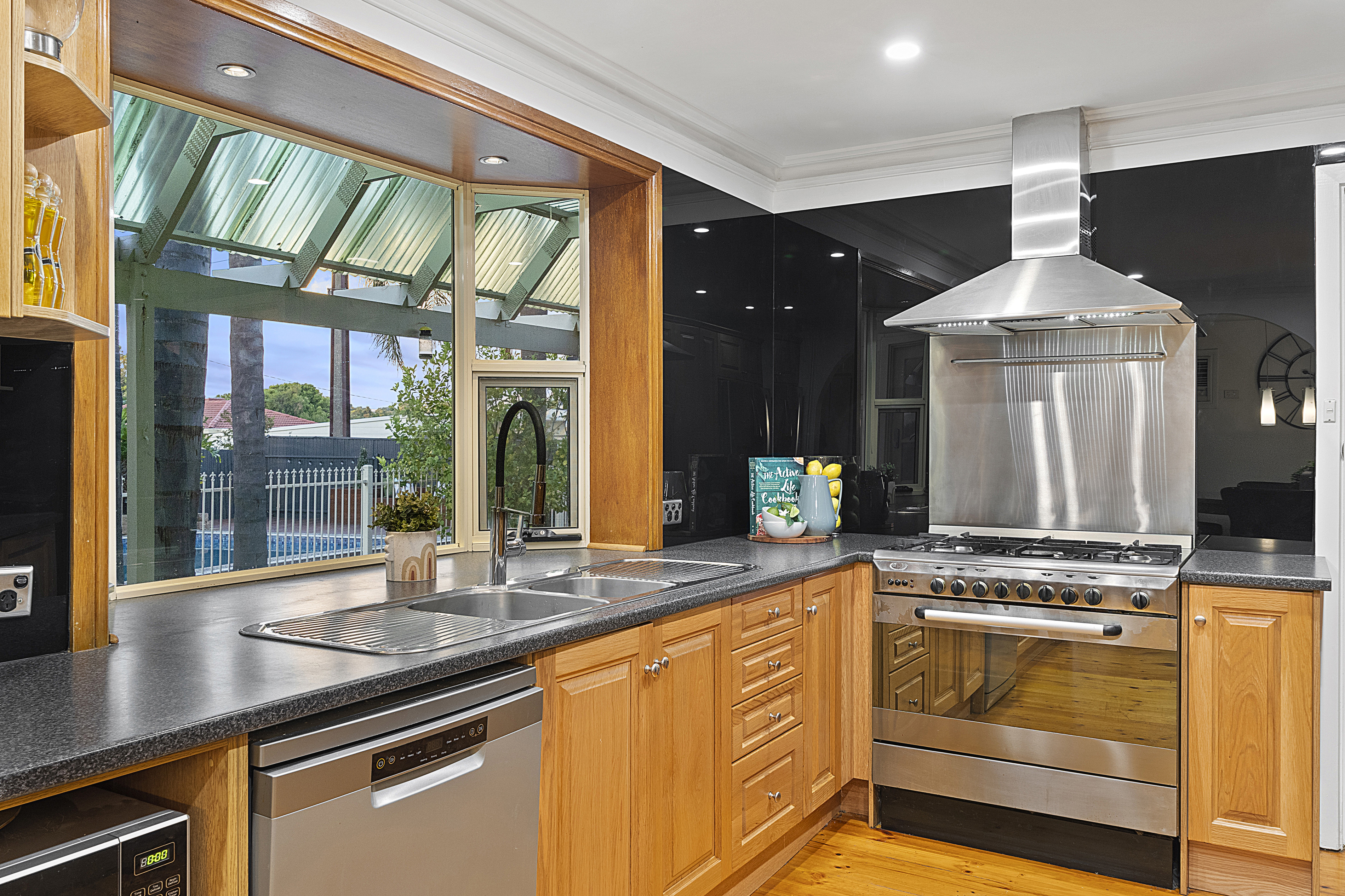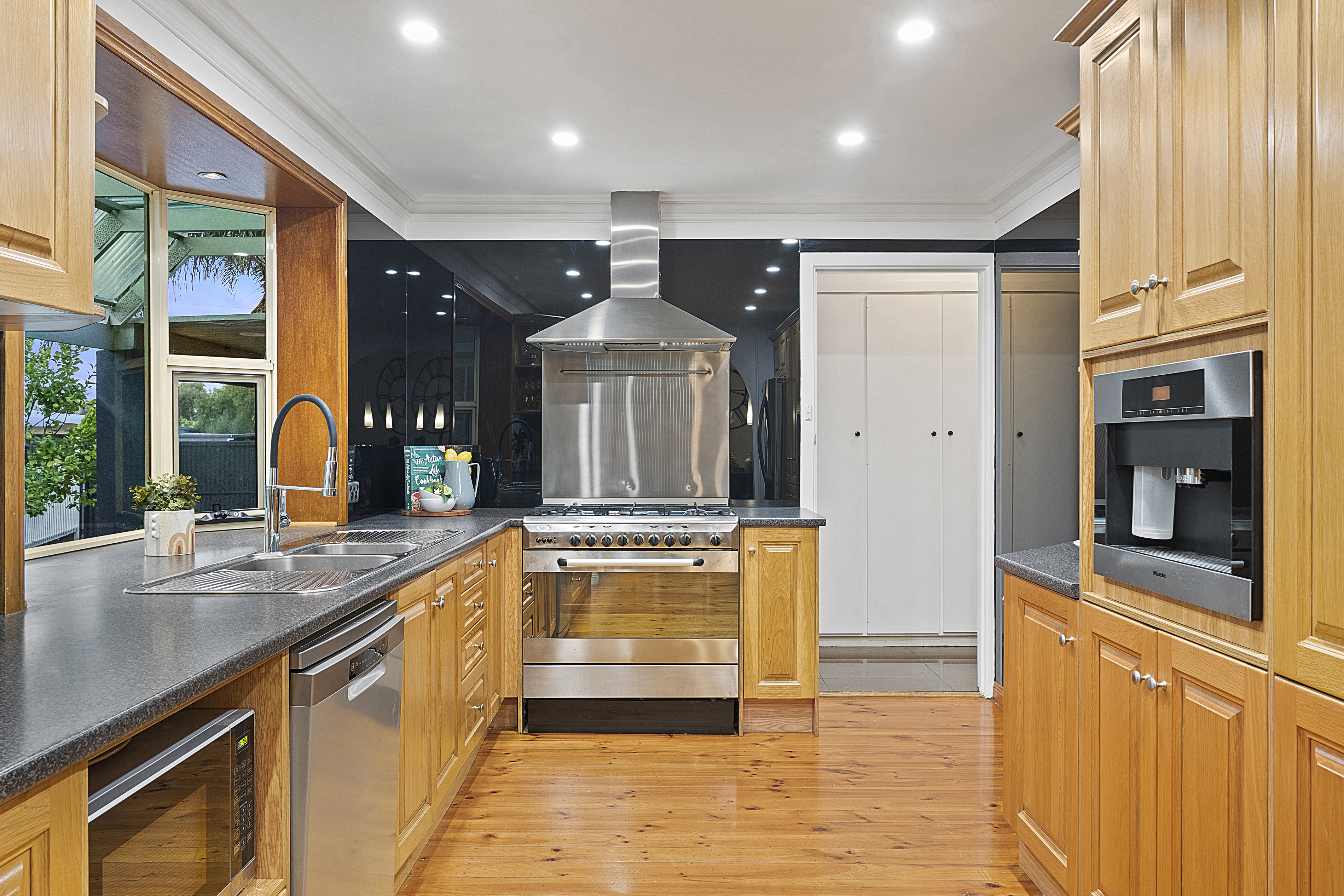 - The kitchen boasts ample amenities for your needs such as ample countertop space, a 5 burner gas cooktop with a stainless steel splashback, a massive oven, a plumbed fridge, high glass splashbacks throughout, a dishwasher, a double sink, a built in coffee machine, overhead cupboards for extra storage and a large window that overlooks the back garden