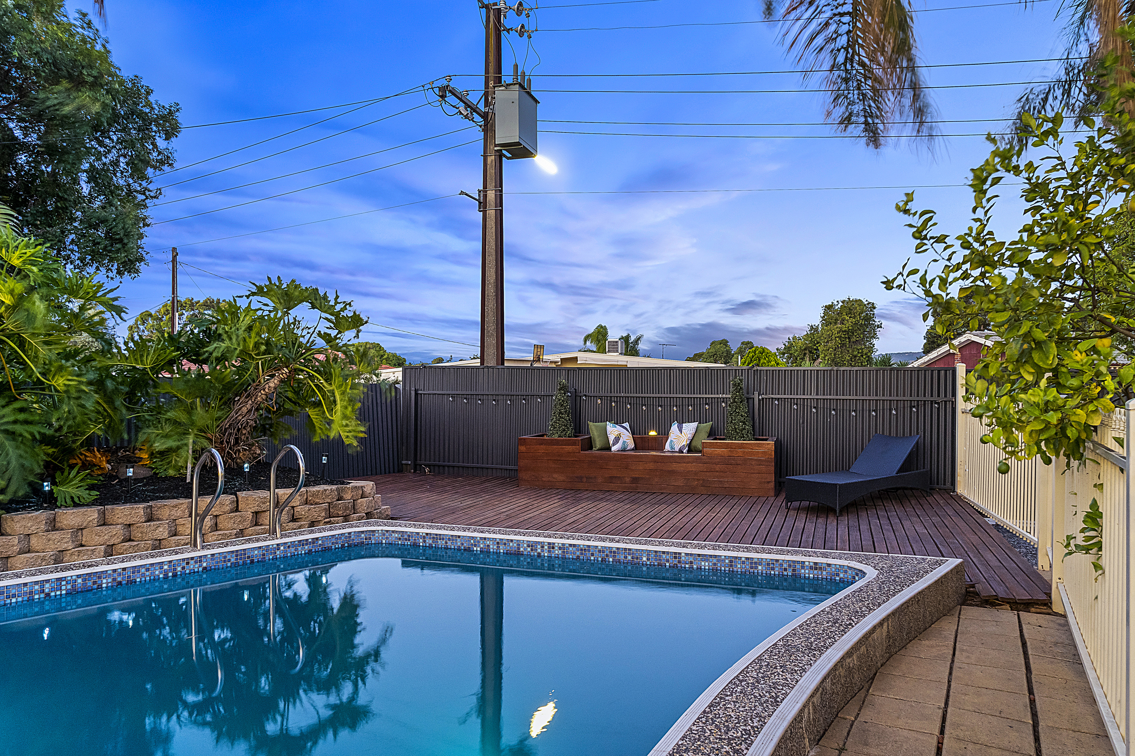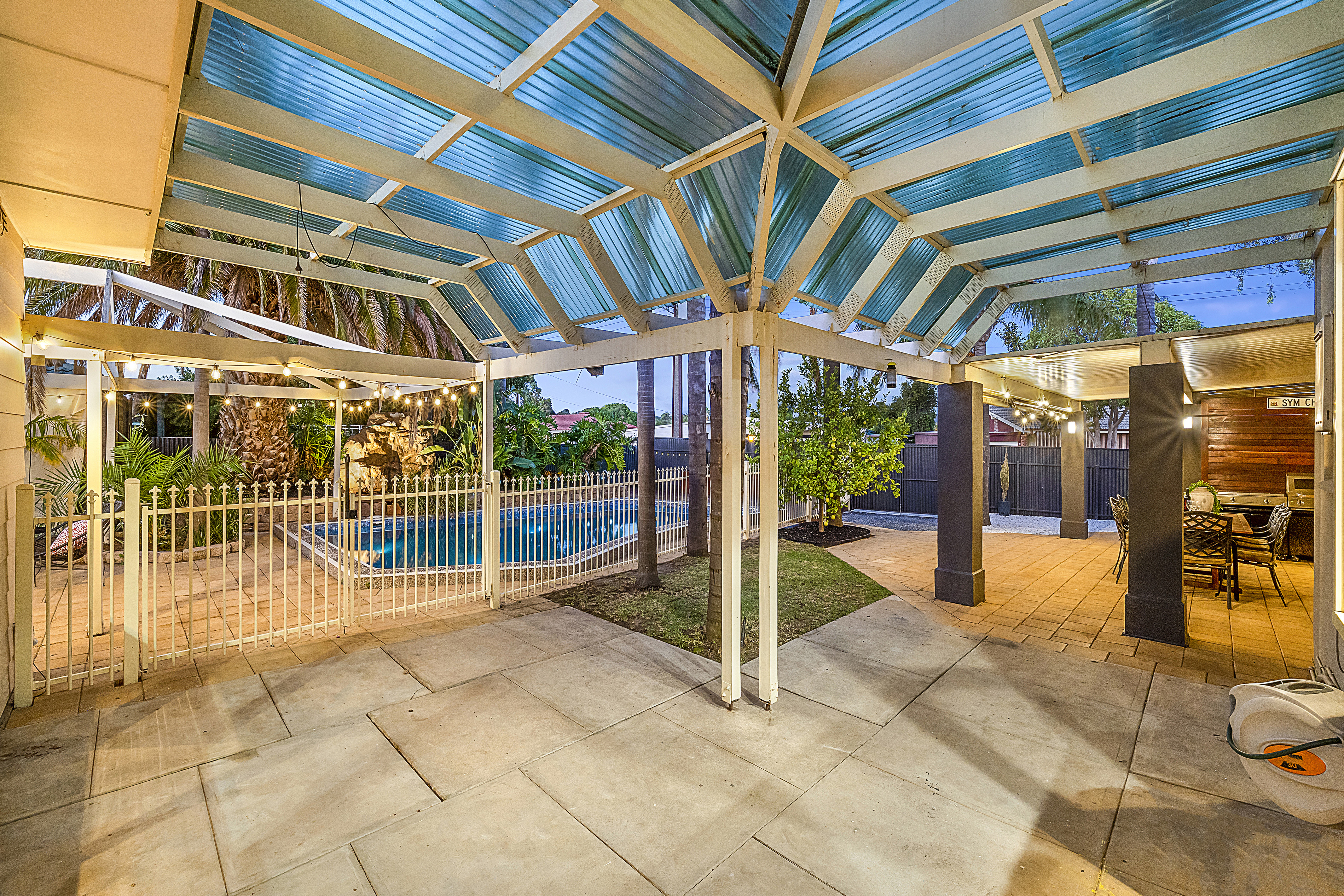 - A large in ground pool, deck, tool shed and water feature all secured behind a gated fence