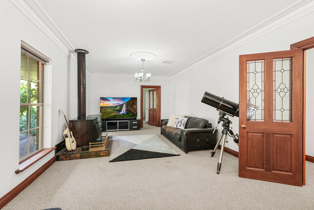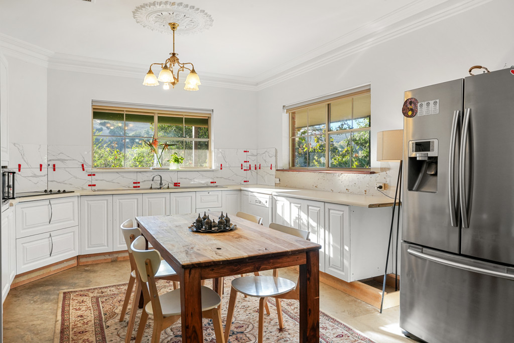 Inside, the home reveals its character through timeless, decorative finishes including ceiling roses, chandeliers, ornate cornicing, and golden fittings. The central living area is of grand proportions, featuring a combustion wood heater to keep the home warm throughout winter. This space flows into the expansive gourmet kitchen, which is currently in the final stages of a modern refresh. Featuring a spacious layout and high-quality cabinetry, the space awaits your final creative touches to complete the vision, allowing you to tailor the finishing details to your own taste while enjoying stunning views over the dam and rolling hills.